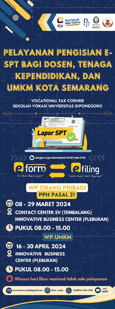 Sebagai langkah rintisan dalam meningkatkan kepatuhan perpajakan dan meringankan beban pengajuan pajak bagi berbagai pemangku kepentingan, Program Studi Akuntansi Perpajakan Sekolah Vokasi Universitas Diponegoro (UNDIP) dengan bangga mengumumkan inisiatifnya untuk memberikan layanan pengarsipan E-SPT (SPT Elektronik) kepada para dosen. , Tenaga Kependidikan, dan Usaha Kecil Menengah (UKM) di Kota Semarang. Dengan semakin meningkatnya ketergantungan pada platform digital dan dorongan pemerintah menuju digitalisasi, Program Akuntansi Perpajakan Sekolah Vokasi UNDIP menyadari pentingnya memfasilitasi proses terkait perpajakan baik bagi perorangan maupun dunia usaha. Layanan E-SPT bertujuan untuk mengefektifkan prosedur pengajuan pajak sehingga lebih mudah diakses dan nyaman bagi wajib pajak.